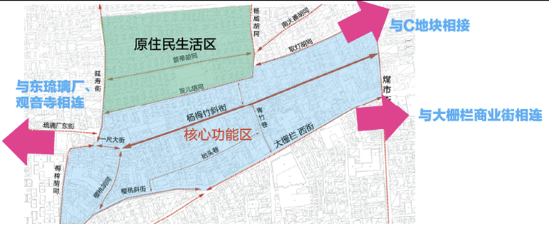 項(xiàng)目位于大柵欄地區(qū)煤市街以西,包括原住民生活區(qū)及楊梅竹核心功能區(qū);項(xiàng)目占地面積約8.8公頃,現(xiàn)狀1711戶,單位70個,現(xiàn)狀建筑面積75920平方米,是實(shí)現(xiàn)大柵欄及東琉璃廠貫通的重要區(qū)域。