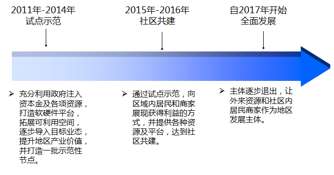 項(xiàng)目實(shí)施推進(jìn)的三個階段:從試點(diǎn)示范,帶動社區(qū)共建,帶動社會主體共同參與,最終實(shí)現(xiàn)區(qū)域全面發(fā)展。