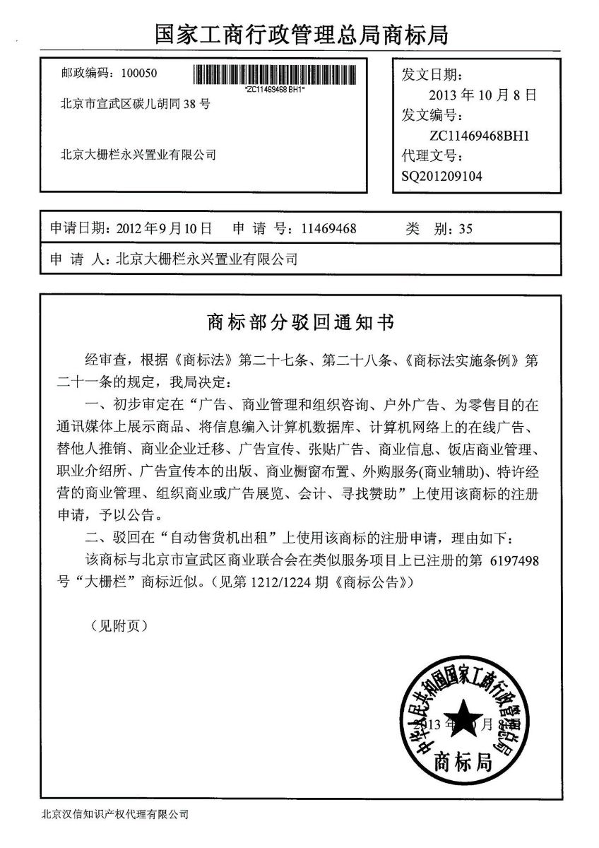 在永興置業(yè)申請(qǐng)的35類注冊(cè)“大柵欄圖形”商標(biāo)中除“自動(dòng)售貨機(jī)出租”這一項(xiàng)駁回,其余20項(xiàng)(1、廣告;2、廣告宣傳;3、計(jì)算機(jī)網(wǎng)絡(luò)上的在線廣告;4、戶外廣告;5、廣告宣傳本的出版;6、商業(yè)櫥窗布置;7、為零售目的在通訊媒體上展示商品;8、張貼廣告;9、商業(yè)信息;10、組織商業(yè)或廣告展覽;11、飯店商業(yè)管理;12、外購服務(wù)(商業(yè)輔助);13、商業(yè)管理和組織咨詢;14、特許經(jīng)營的商業(yè)管理;15、替他人推銷;16、職業(yè)介紹所;17、商業(yè)企業(yè)遷移;18、將信息編入計(jì)算機(jī)數(shù)據(jù)庫;19、會(huì)計(jì);21、尋找贊助)已經(jīng)通過初審。