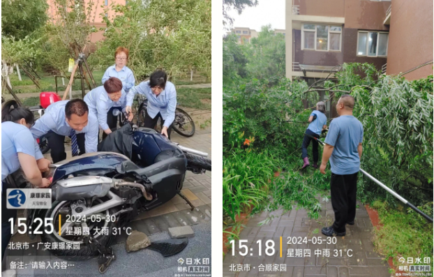 強降雨大風來臨后,天寶物業(yè)公司又積極組織各項目部職工頂風冒雨加大公區(qū)、中控機房的巡視力度和頻次,對突發(fā)的樹木倒塌、低洼點位積水等情況派專人查看并在現(xiàn)場值守,提醒居民注意安全,同時立即協(xié)調(diào)配合電力、園林、市政等有關(guān)部門對倒塌的樹木、低洼點位積水進行清理,確保居民生命財產(chǎn)安全。